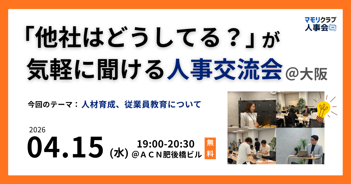 直近開催のイベント 【第12回】人事・採用の「他社はどうしてる?」が気軽に聞ける交流会|2026/3/10(火)大阪開催 【第13回】人事・採用の「他社はどうしてる?」が気軽に聞ける交流会|2026/3/18(水)新宿開催 【第14回】人事・採用の「他社はどうしてる?」が気軽に聞ける交流会|2026年4月15日(水)大阪開催 もっと見る