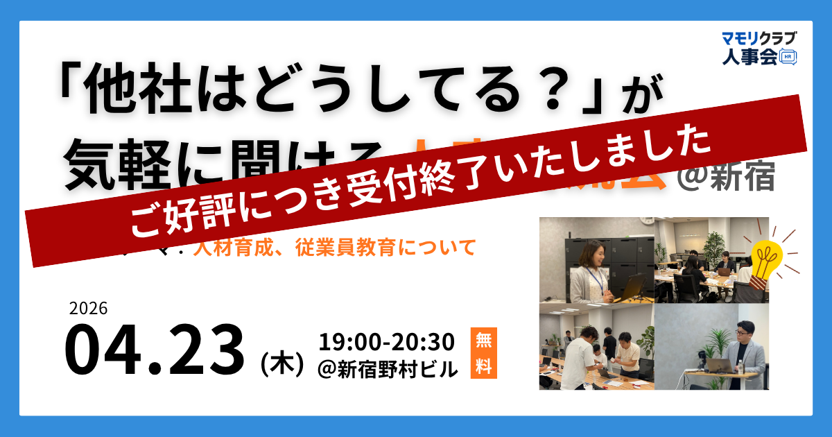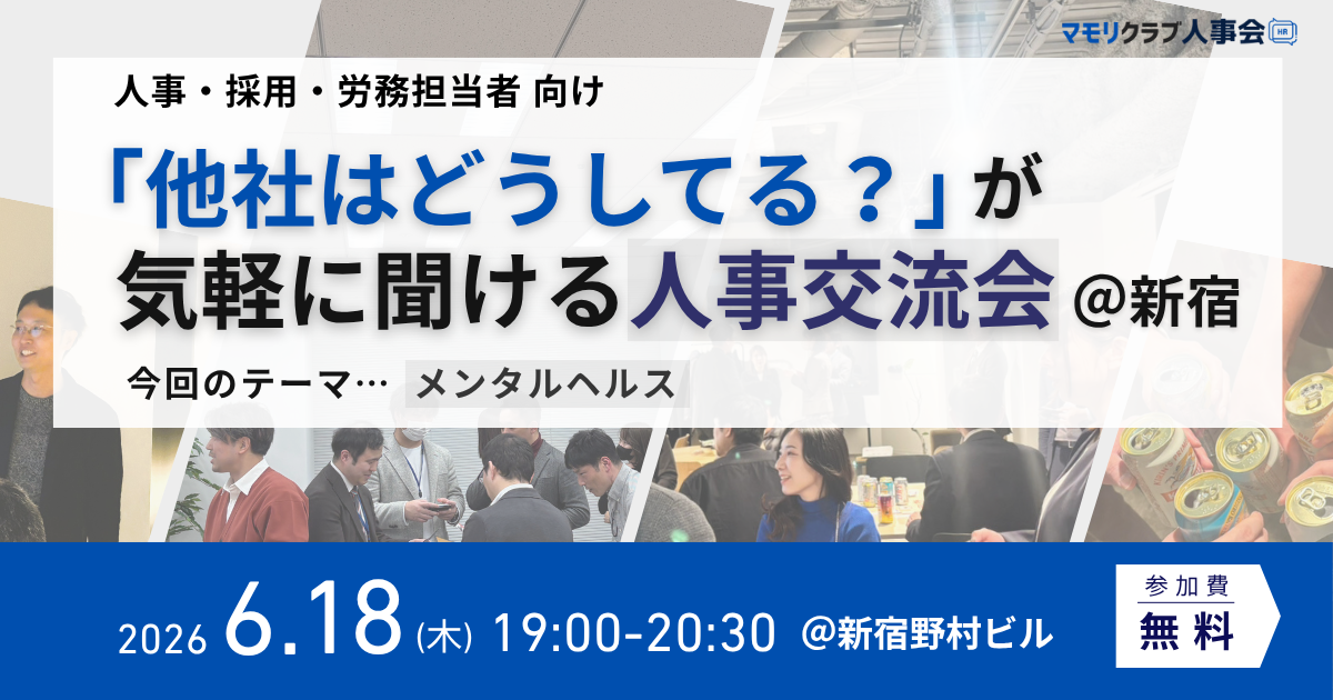 直近開催のイベント 【第14回】人事・採用の「他社はどうしてる?」が気軽に聞ける交流会|2026年4月15日(水)大阪開催 【第15回】人事・採用の「他社はどうしてる?」が気軽に聞ける交流会|2026年4月23日(木)東京開催 【第16回】人事・採用の「他社はどうしてる?」が気軽に聞ける交流会|2026年5月21日(木)東京開催 もっと見る