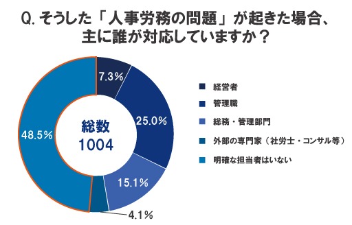 「そうした『人事労務の問題』が起きた場合、主に誰が対応していますか?」という設問に対し、最も多かった回答は「明確な担当者はいない(48.5%)」でした。