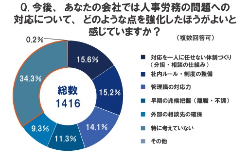 「今後、あなたの会社では人の問題への対応について、どのような点を強化したほうがよいと感じていますか?」という設問に対し、最も多かった回答は「特に考えていない」で34.3%でした。