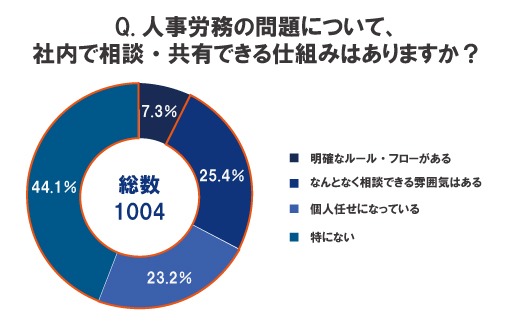 「人事労務の問題について、社内で相談・共有できる仕組みはありますか?」という設問に対し、最も多かった回答は「特にない(44.1%)」でした。