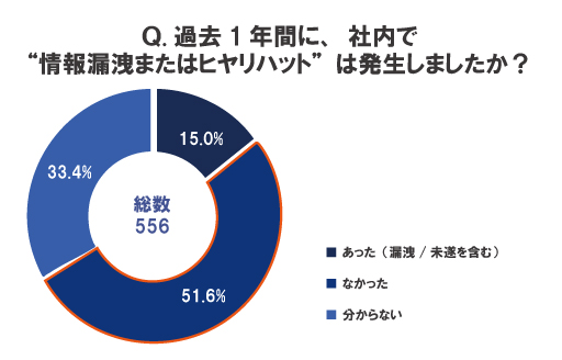 「過去1年間に、社内で“情報漏洩またはヒヤリハット”は発生しましたか?」という設問に対しては、半数以上の51.6%が「なかった」と回答しました。