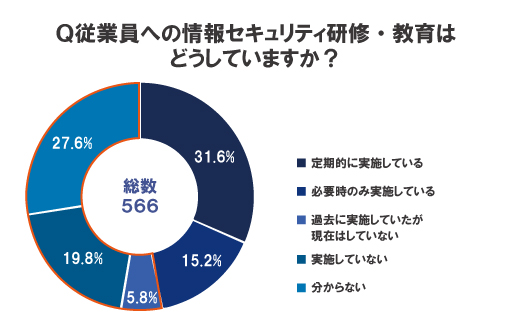 「従業員への情報セキュリティ研修・教育はどうしていますか?」という設問に対して、最も多かったのは31.6%で「定期的に実施している」という回答でした。