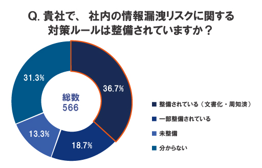 「貴社で、社内の情報漏洩リスクに関する対策ルールは整備されていますか?」という設問に対しては、「整備されている(文書化・周知済み)」という回答が最も多く全体の36.7%でした。