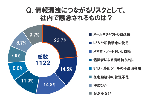 「情報漏洩につながるリスクとして、社内で懸念されるものは?」という設問に対し、最も多かったのは「メールやチャットの誤送信」で23.7%でした。