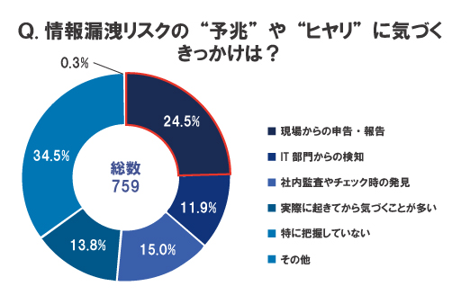 「情報漏洩リスクの“予兆”や“ヒヤリ”に気づくきっかけは?」という設問に対して最も多かった回答は「特に把握していない」の34.5%でした。