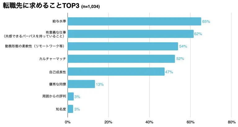 ウォンテッドリー株式会社の調査では、求職者が転職先を選ぶ際に重視する項目として「共感できるパーパス(社会的意義)を持っていること」を挙げた方が62%に達しており、「給与水準(65%)」の次につけています[2]。