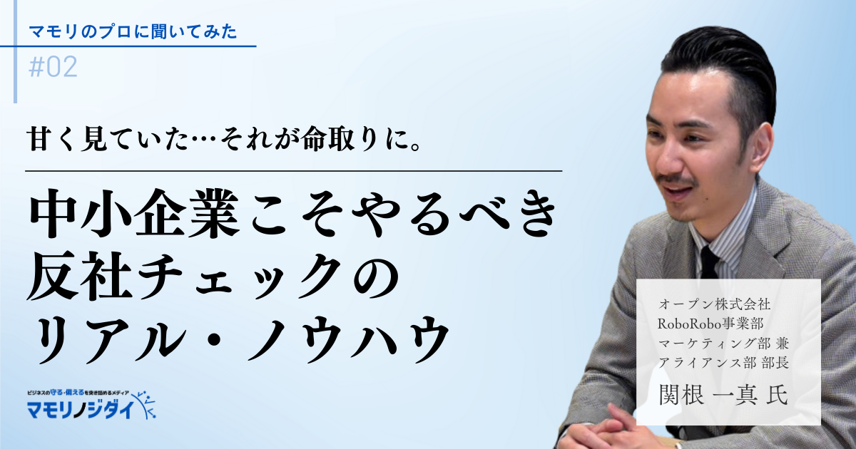 中小企業こそやるべき反社チェックのリアル・ノウハウ今回は、コンプライアンスチェックを自動化できるツール「RoboRobo コンプライアンスチェック」を展開するオープン株式会社 RoboRobo事業部 営業本部 セールス部 兼 アライアンス部 部長の関根氏に、反社チェックの基本、実務上の留意点、対応時の考え方について詳しく伺いました。