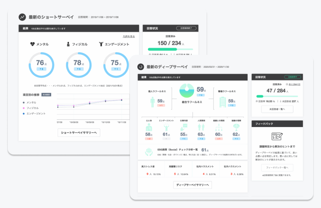 | 「従業員エンゲージメント」とは、社員の働く活力や満足感を総合的に示す指標です。構成要素は「精神的ストレス(不安・倦怠感)」「組織の生産性や成長実感」「報酬やキャリアへの納得感といった心理・制度的要素。 これらに最も大きな影響を与えるのは 「個人の健康状態」と「上司との関係性・コミュニケーション」です。当社のデータでは、社員が健康で、かつ直属の上司を信頼できていれば社員は辞めにくい、と言えます。 たとえ収入が他社より低かったとしても、結婚や出産などのライフステージの節目があったとしても、自分のマネージャーや3年上の先輩が組織に貢献しながらいきいきと働く姿が見えることが、離職を防ぐのです。そのためにはさきほど挙げた「経営理念の浸透」が不可欠です。 当社では、このようにラフールサーベイの膨大なデータをもとに、エンゲージメント低下の兆しや離職リスクを早期に検知する仕組みを持っています。「データが示す兆し」と「人が寄り添う支援」、この両方が揃って初めて、企業の“守備力”は真に高まるため、感覚ではなくデータをいかに活用するかも今後さらに必要になっていくと感じます。 |